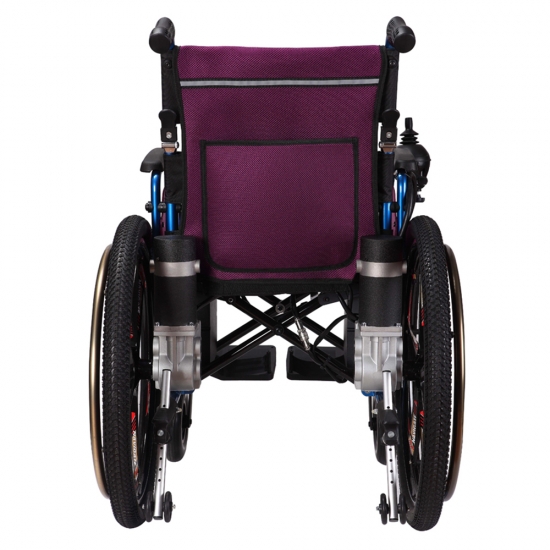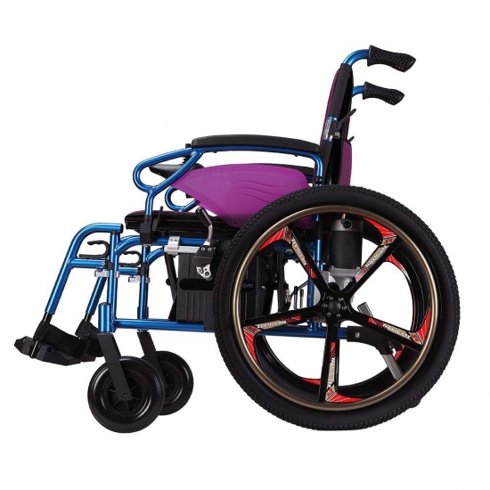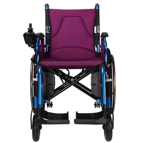 Suit for wheelchair-assisted employees/first time electric wheelchair users. High efficiency motor and 200x50 mm PU front wheel and 24 inch pneumatic tyres rear wheels provide users with full control and great maneuverability, this lightweight power wheelchair making overcoming outdoor slope and gaps effortless.